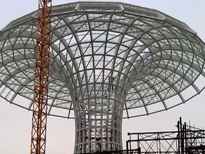 二、球形网架结构因其结构新颖,受力合理,自重轻、用钢量低等优点。如大型体育场馆球形赤壁螺栓球网架、公共场馆球形网架、电厂赤壁螺栓球网架、水泥工业球形网架、仓储物流球形网架、赤壁干煤棚工业球形网架、赤壁收费站赤壁加油站球形网架、展览中心、影剧院、商场、航站楼、候车厅、工厂赤壁车间、仓库、电视塔等球形螺栓球节点网架。国内球形网架结构主要分为:赤壁焊接球节点网架及螺栓球节点网架两种。螺栓球节点网架其构件工厂内加工量较大,现场安装便捷,适用于现场工期紧,赤壁施工条件、用电量受制约,网架形状复杂、赤壁杆件定位困难的异形结构。螺栓球节点球形网架系统基本由赤壁杆件、螺栓球、支撑支座等组成。按照节点形式可分为交叉赤壁桁架体系、四角锥体系、三角锥体系等。支撑方式多为固定支座支撑。对于大面积、大跨度及有特殊受力或伸缩要求的网架结构可采用橡胶支座、滑移支座、球铰支座等支撑形式,以满足结构自身的受力稳定、均衡,便于内力释放等设计要求。